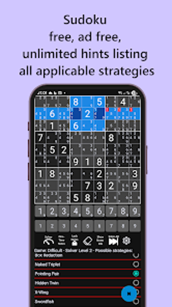 Sudoku Strategy Step-by-Step är en gratis Android-app designad för att hjälpa användare att förbättra sina Sudoku-färdigheter genom att utforska avancerade strategier som Pointing Pairs, Hidden Twins, Box Reduction, X-Wing och Swordfish. Appen erbjuder obegränsade annonserfria ledtrådar med konfigurerbar detaljnivå och kan visa alla möjliga strategier för nästa drag, vilket gör det enkelt att förstå och tillämpa dessa tekniker.